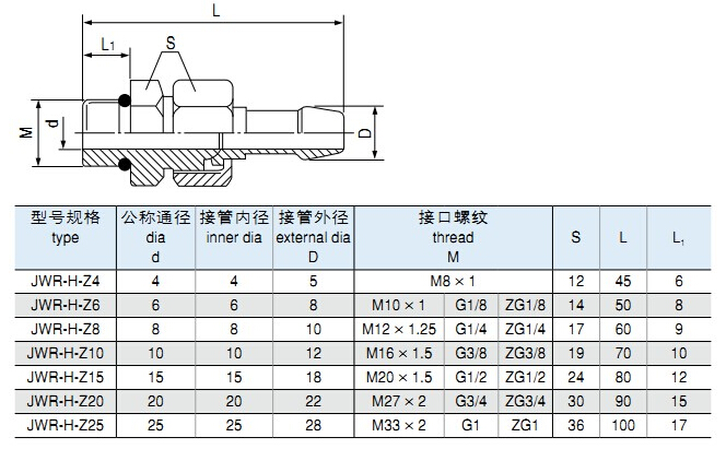 JWR-H-Z4,JWR-H-Z6,JWR-H-Z8,JWR-H-Z10,JWR-H-Z15,JWR-H-Z20,JWR-H-Z25,外插式直通终端活节管接头