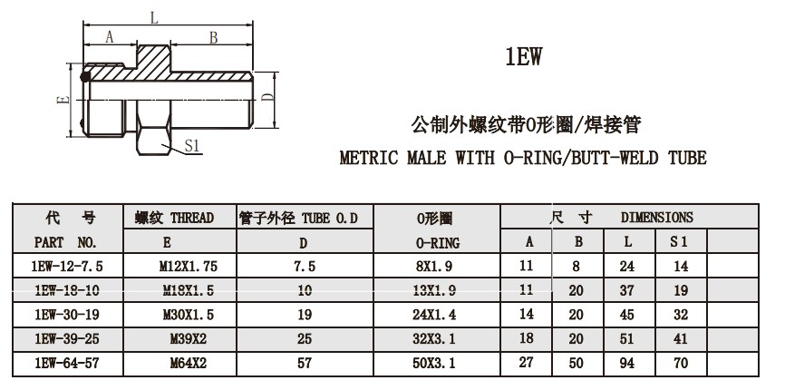 1EW-12-7.5,1EW-18-10,1EW-30-19,1EW-39-25,1EW-64-57,平面密封接头