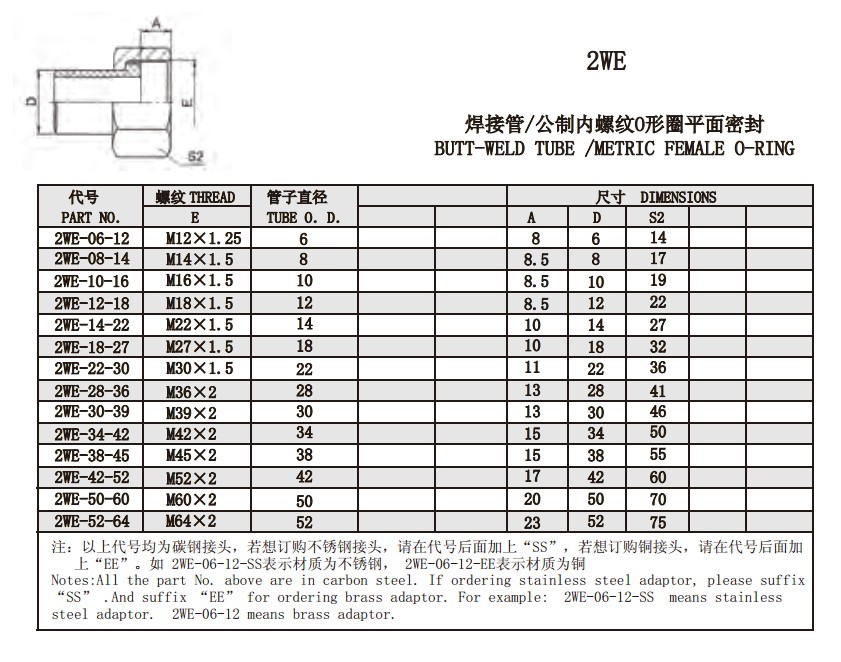 2WE-06-12,2WE-08-14,2WE-10-16,2WE-12-18,2WE-14-22,2WE-18-27,2WE-22-30,2WE-28-36,平面密封接头