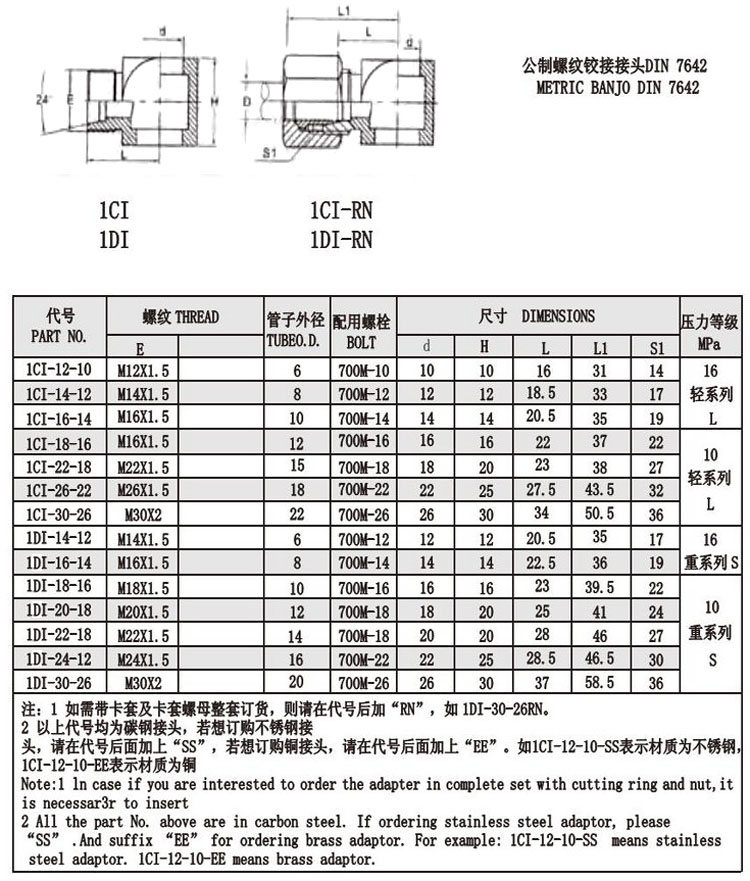 1CI-12-10,1CI-14-12,1CI-16-14,1CI-18-16,1DI-22-18,1DI-24-12,1DI-30-26,公制螺纹卡套接头
