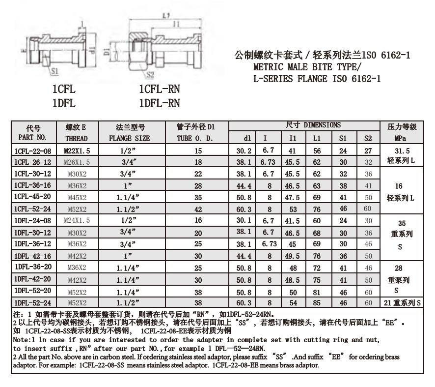 1CFL-22-08,1CFL-26-12,1CFL-30-12,1CFL-36-16,1DFL-42-20,1DFL-52-20,1DFL-52-24,公制螺纹卡套接头