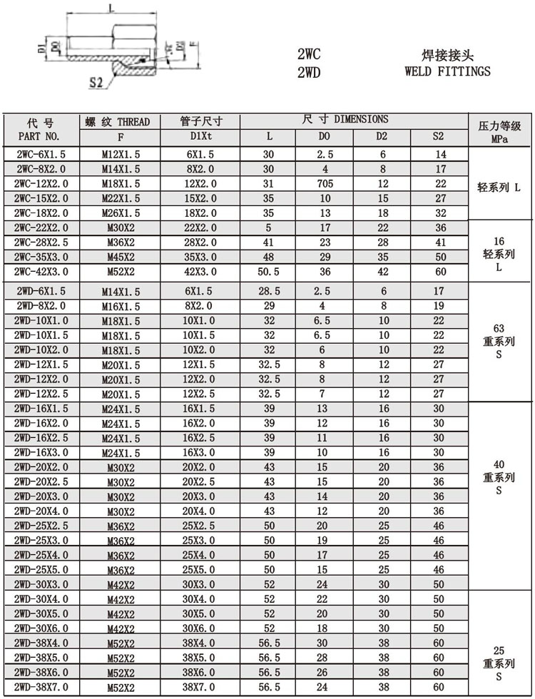 2WC-6×1.5,2WC-8×2.0,2WC-12×2.0,2WC-15×2.0,2WD-16×2.0,2WD-16×2.5,2WD-16×3.0,焊接接头