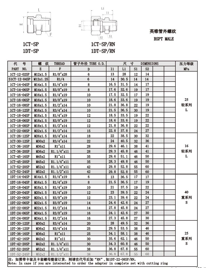 1CT-12-02SP,1CT-14-04SP,1CT-22-08SP,1DT-36-16SP,1DT-42-16SP,1DT-52-20SP,公制螺纹卡套接头