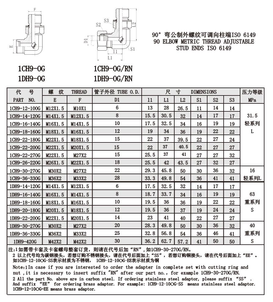 1CH9-12-12-100G,1CH9-22-22-180G,1CH9-30-30-270G,1DH9-36-36-330G,1DH9-420G,公制螺纹卡套接头