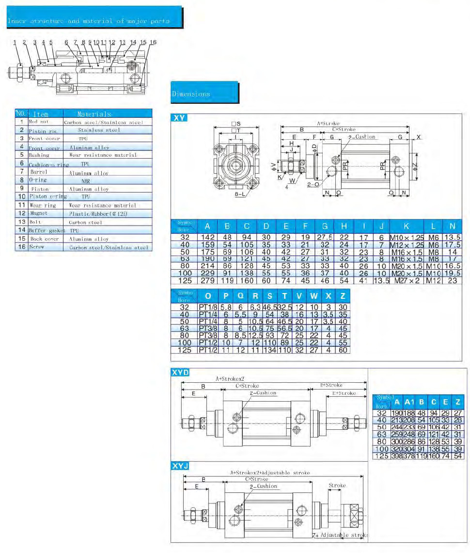 XY-32,XY-40,XY-50,XY-63,XY-80,XY-125,XYD-32,XYD-40,XYD-50,XYJ-63,XYJ-80,XYJ-100,Shinya气缸