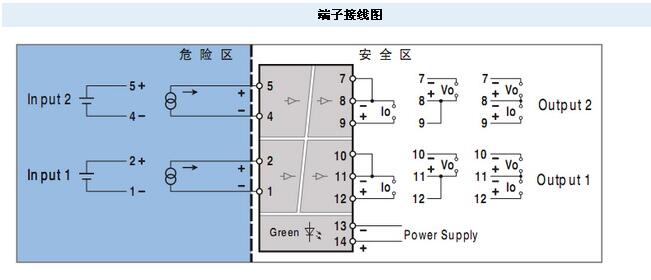 将处于现场危险区域的各种设备的直流信号(4~20mA,0~5V),经过安全栅隔离、抗干扰抑制等处理后。向安全侧的控制系统或其它智能仪表输出直流电流或 电压信号。2路输入,2路输出。