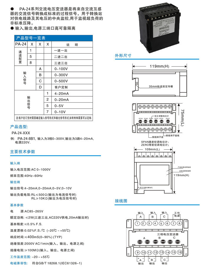 PA-24-1A1,PA-24-1A2,PA-24-1C5,PA-24-1C7,PA-24-5D1,PA-24-8D7,PA-24,三相交流电压变送器