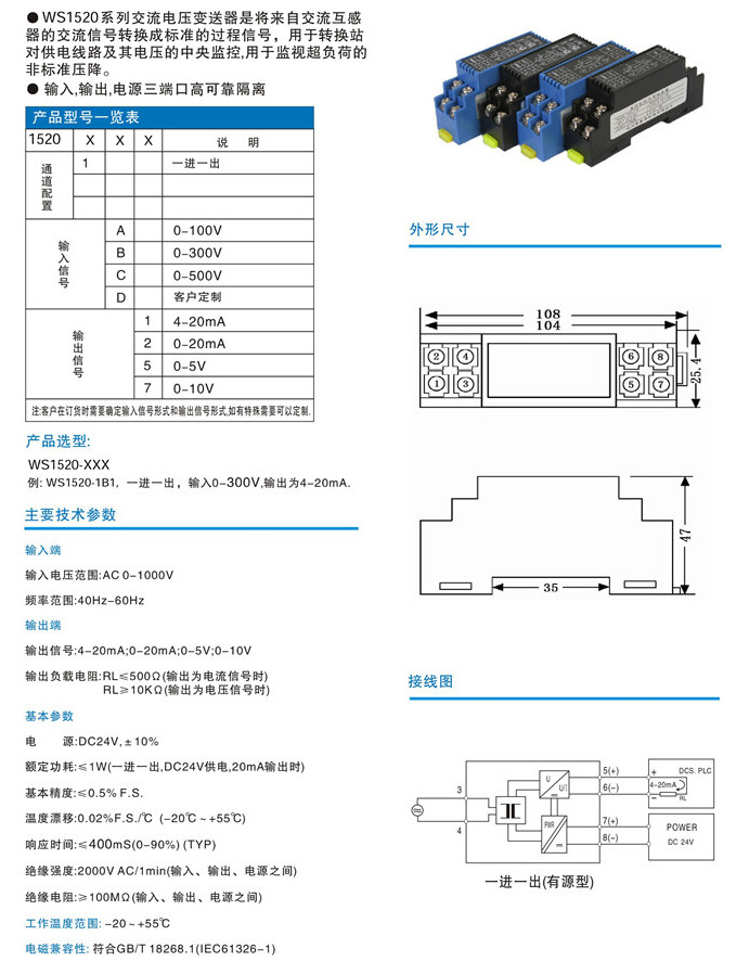 WS1520-1A1,WS1520-1A2,WS1520-1A5,WS1520-1D2,WS1520-1D5,WS1520-1D7,WS1520,交流电压变送器