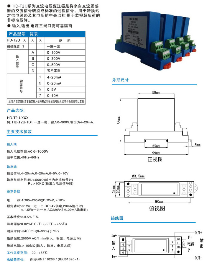HD-T2U-1A1,HD-T2U-1A2,HD-T2U-1A5,HD-T2U-1C1,HD-T2U-1D5,HD-T2U-1D7,HD-T2U,交流电压变送器
