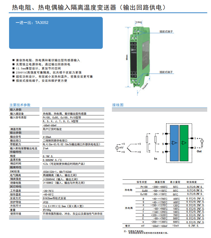 TA3052,热电阻、热电偶输入隔离温度变送器(输出回路供电)