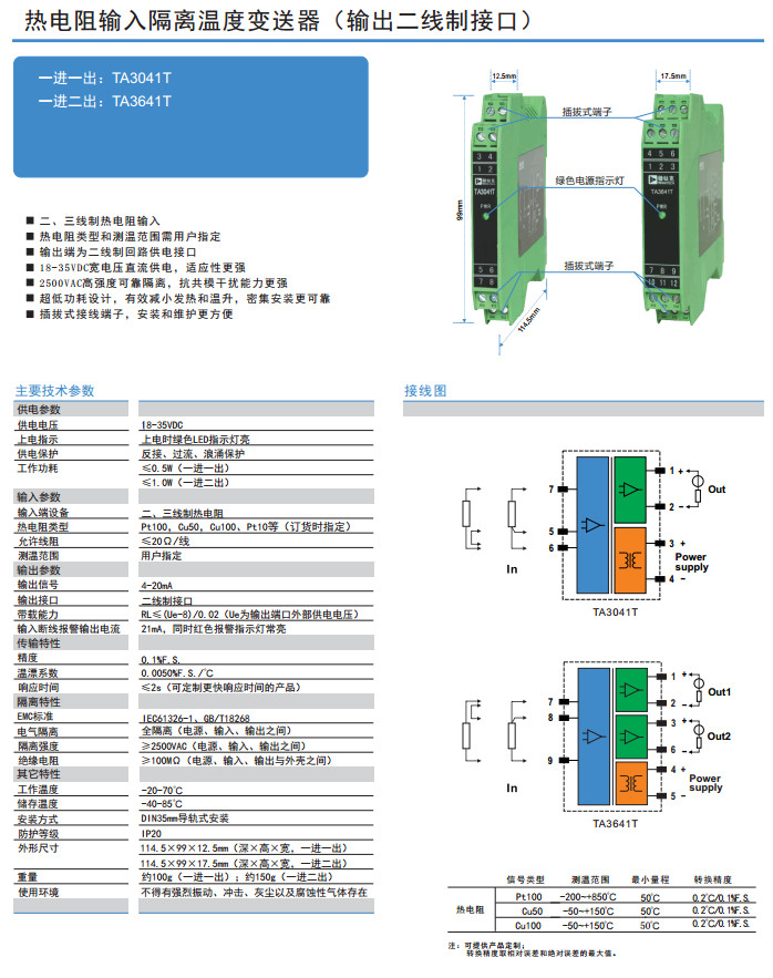 TA3041T,TA3641T,热电阻输入隔离温度变送器(输出二线制接口)