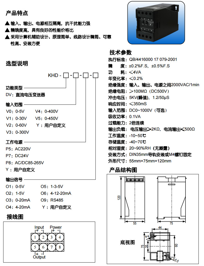 描述: 此型号为直流电压变送器,输入信号为直流0~300V,输出4~20mAdc, 工作电源DC18~90V