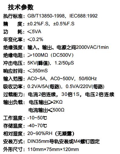 描述: 此型号为三相三线有功功率变送器,5Aac 电流互感器(CT)变比电流信号,100Vac电压互感器(PT)变比电压信号输入,输出4~20mAdc,功率基准数866W,工作电源AC22V.