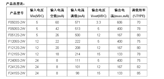 F0503S-2W,F0505S-2W,F0512S-2W,F1205S-2W,F1212S-2W,F1215S-2W, F2405S-2W,F2412S-2W,F2415S-2W,定电压输入3KV隔