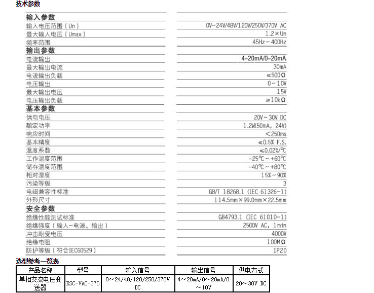 • 型号: ESC-VAC-370,单相交流电压变送器