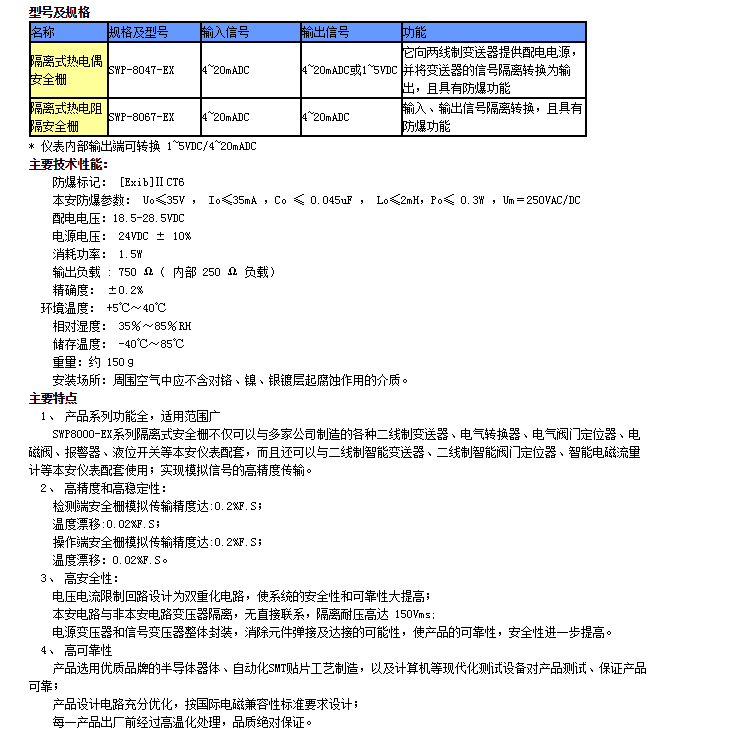 SWP-8047-EX,SWP-8067-EX,隔离式热电偶安全栅