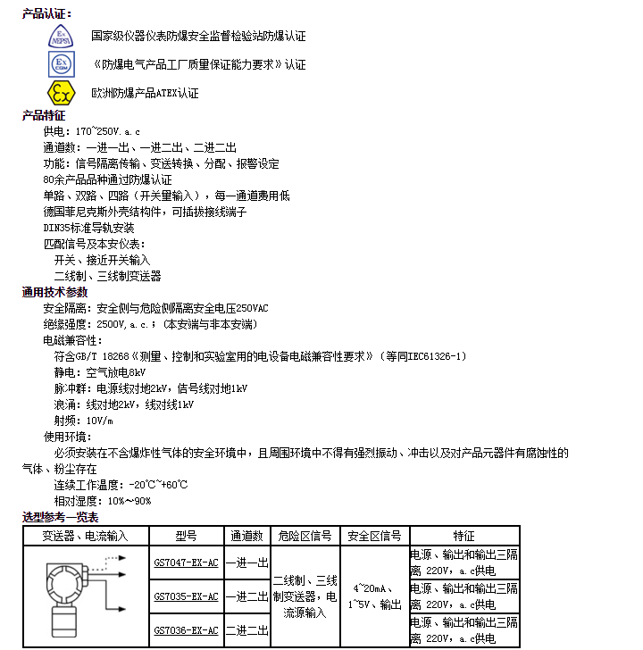 GS7047-EX-AC,GS7035-EX-AC,GS7036-EX-AC,交流供电隔离栅