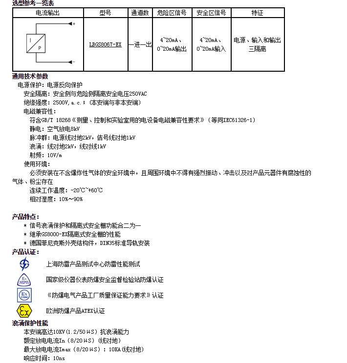 LBGS8067-EX,电流输出浪涌保护隔离栅