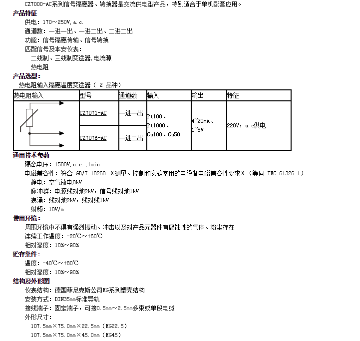 CZ7071-AC,CZ7076-AC,隔离温度变送器