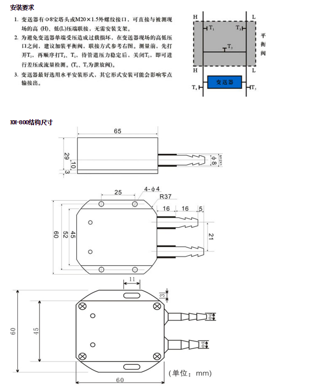 主要特点 外形精巧,安装方便; 阻尼滤波设计使它受动压的影响小; 可同时用于差压、压力、负压测量; 可带低功耗、宽温区的LCD显示表; 零位、满度均现场可调; 高过载和高静压设计; 输出信号、电气连接和压力接口均采用标准化设计。 技术规格