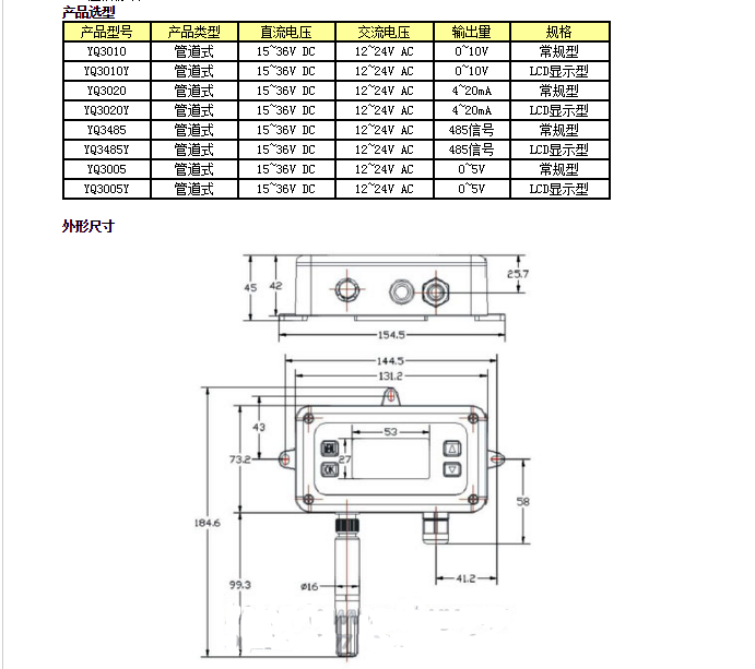 产品概述 壁挂式型温湿度变送器选用高质量高精度数字温湿度传感器,具有优良的长期稳定性、低延滞性、强抗化学污染能力和极优的可重复性。是暖通空调应用中精确测量相对湿度及温度的理想解决方案。外型美观、数字化校准、全量程温度补偿、温湿度测量范围宽、高低温湿度测量精确。可应用于纺织、食品、科研、环保、仓库、气象台、车间、厂房、仓库、图书馆、办公室、微机房、实验室、大棚等环境温湿度的监控。 技术参数 1、相对湿度(以下各项参数如没特殊说明,均在25℃条件下) 量程:0~99.9%RH 准确度(包括非线性度,迟滞和重复性):±2%RH 工厂校验不确定度:±0.6%RH(0~40%RH) / ±1.0%RH(40~97%RH) 响应时间 (90 %) 静止空气 8s,塑料隔栅 分辨率:0.1%RH 长期稳定性:<0.5%RH /年 2、温度 准确度:(25℃) 0.3℃ 分辨率:0.1℃ 长期稳定性:<0.1℃/年 3、工作环境 工作环境温度:-55~125℃ 工作环境湿度:0~99.9%(无凝露) 存储范围 温度: 0~60 ℃ 湿度:<90% RH 4、输入输出 工作电压:12~36V DC (12~24V AC) 上电时间:5s 湿度电压输出:0~10VDC、4~20mA、0~5V、RS485 温度电压输出:0~10VDC、4~20mA、0~5V、RS485 通信协议:MODBUS RTU