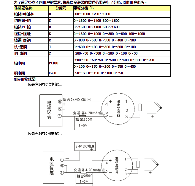 3、负载能力:供电电压为24V时,负载为0~250Ω;