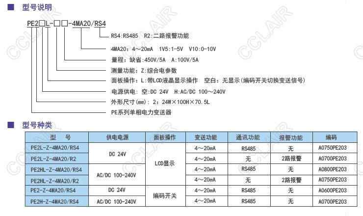 PE2L-Z-4NA20/RS4,PE2L-Z-4MA20/R2,PE2HL-Z-4MA20/RS4,PE单相电量变送器