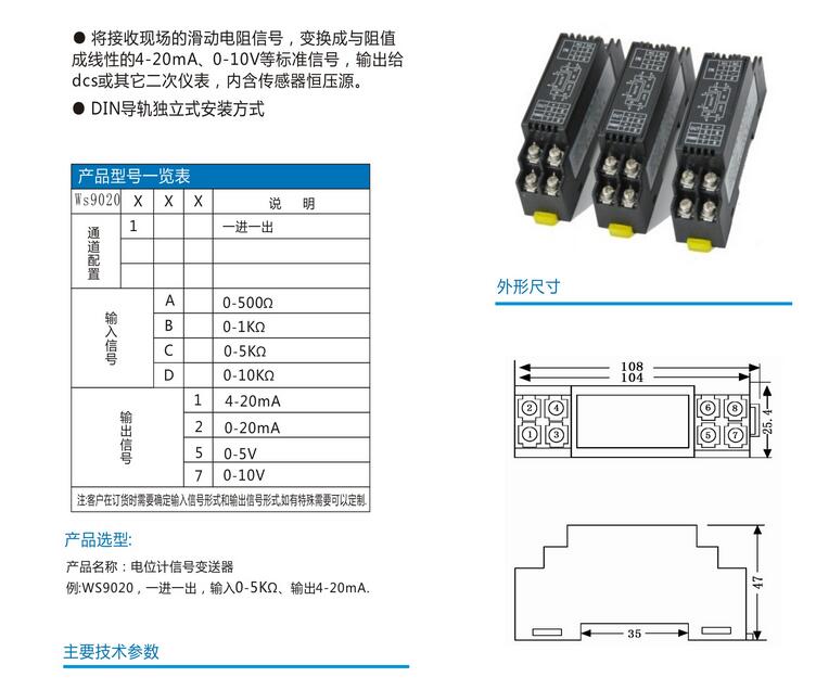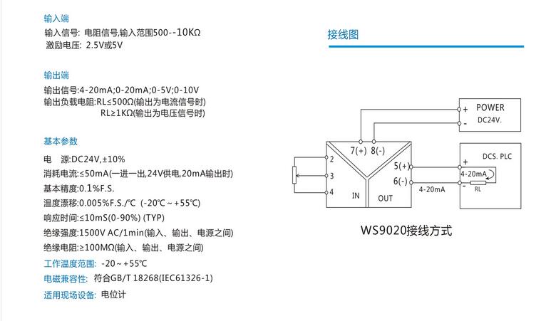 WS9020电位计变送器 电位计信号隔离器技术参数详细介绍: