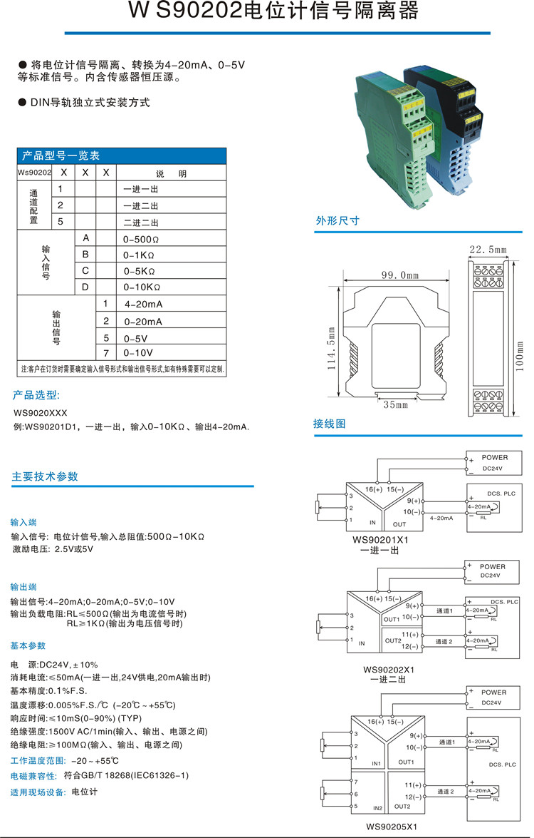 WS9020-1A1,WS9020,电位计位移信号调理器隔离器.