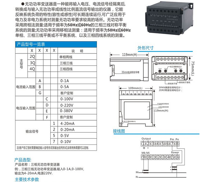 无功功率变送器输入电流:AC0-1A、0-5A、电压(订货时请注明是三相三线还是四线):AC0-100V、380V等用户特定