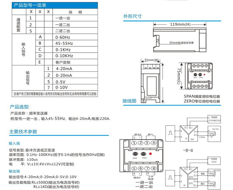 JD20F频率变送器隔离器输出范围:DC4-20mA、0-20mA、0-5V、0-10V、1-5V等用户需要的标准信号