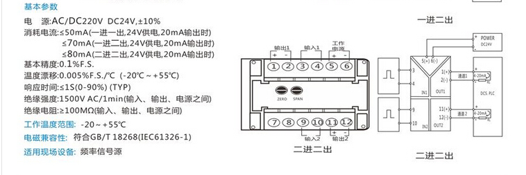 GE703-F频率变送器输出范围:DC4-20mA、0-20mA、0-5V、0-10V、1-5V等用户需要的标准信号