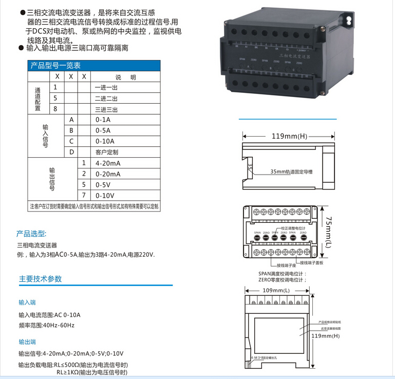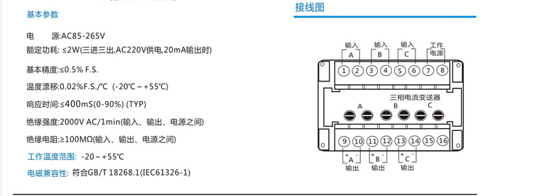 三相电压变送器输出范围:DC4-20mA、0-20mA、0-5V、0-10V、1-5V等用户需要的标准信号