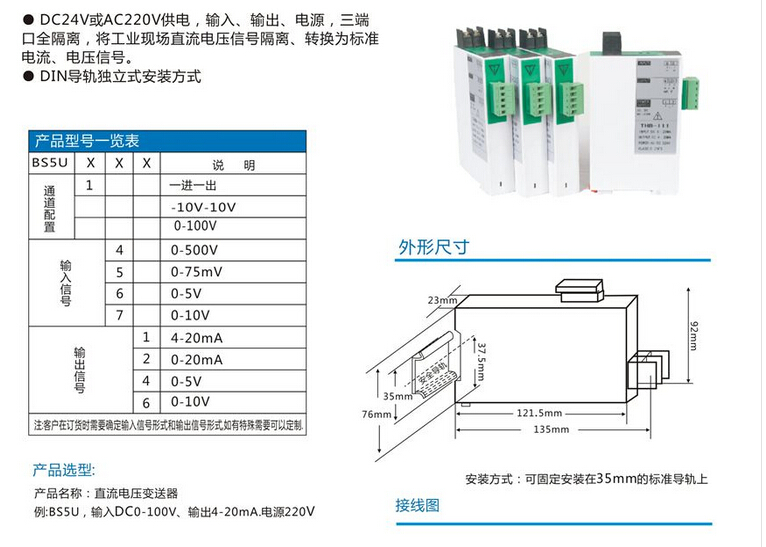 直流电压变送器输出范围:DC4-20mA、0-20mA、0-5V、0-10V、1-5V等用户需要的标准信号