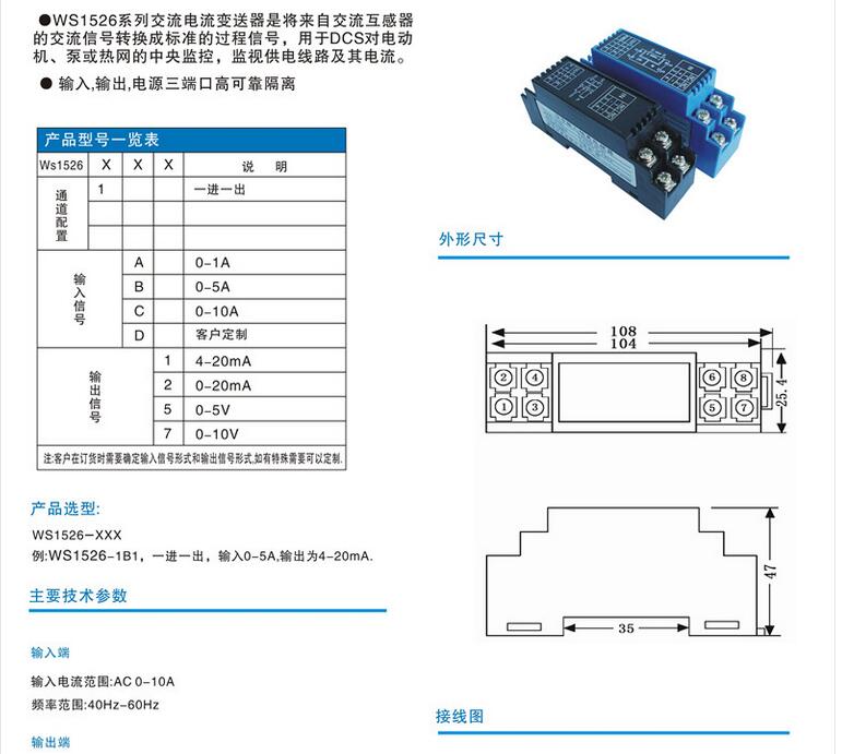 WS1526-1B1,WS1526全隔离交流电流信号变送器。