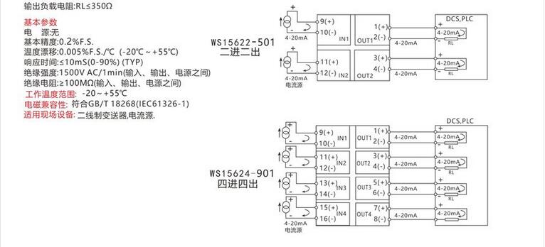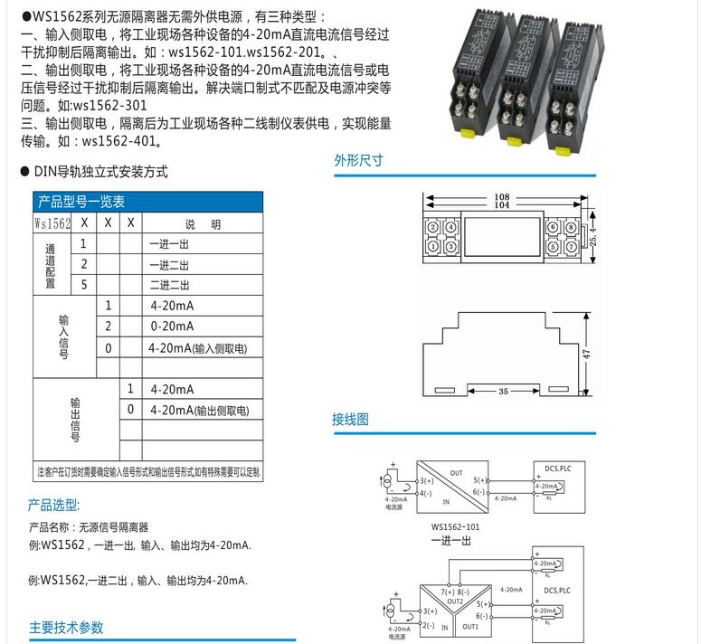 WS1562无源过程电流信号隔离器4-20mA 0-20mA无需外接电源,输入输出隔离传输精度高,二线制接线,DIN T型导轨安装