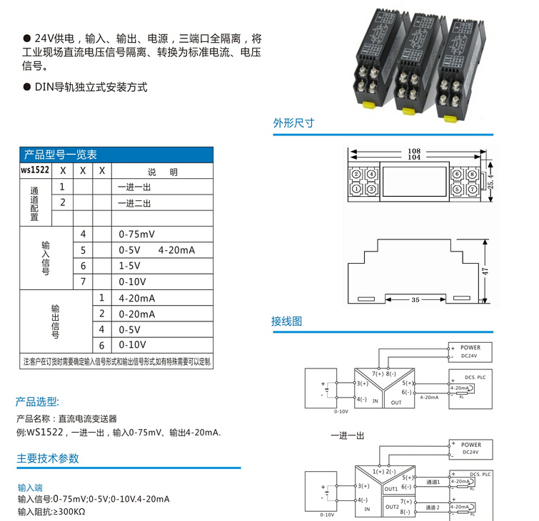 WS1522,WS1522-141,三端口电流信号隔离器。