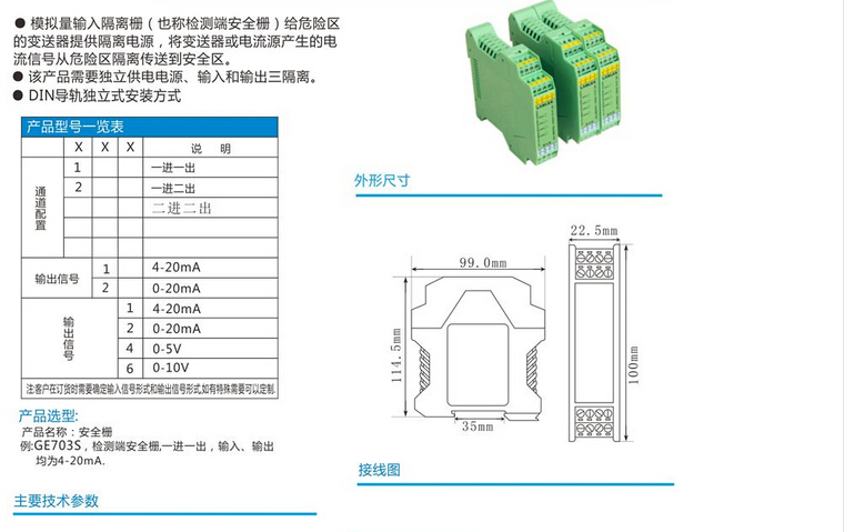 GE703S系列防爆安全栅4-20mA 隔离式安全栅 检测端安全栅, 将输入信号检测端4-20mA变换为相互隔离的信号,低功耗,低热量,低漂移,DIN T型导轨安装