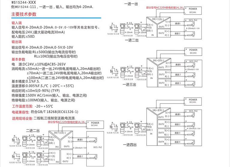 WS15244信号隔离器 隔离栅,全隔离信号分配器 隔离栅,信号隔离器模块,安全栅,电流转换模块。将输入信号变换为两路相互隔离的信号,低功耗,低热量,低漂移,DIN T型导轨安装