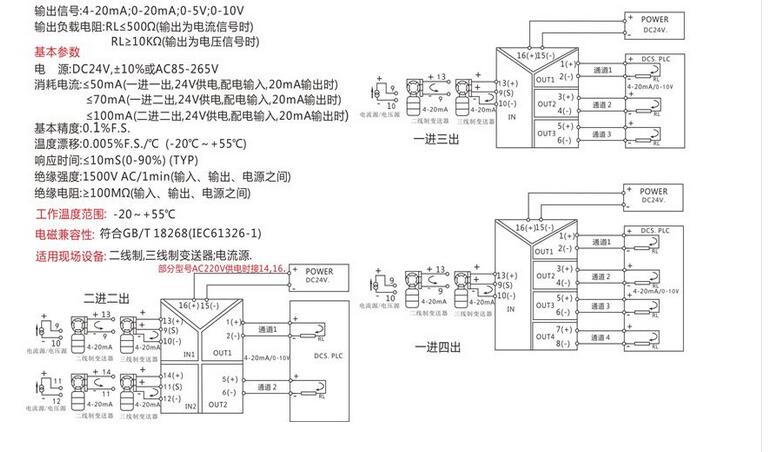 信号隔离器分配器输出范围:0-10V、4-20mA、0-20mA、0-5V。1-5V,-0-10V等用户需要的标准信号
