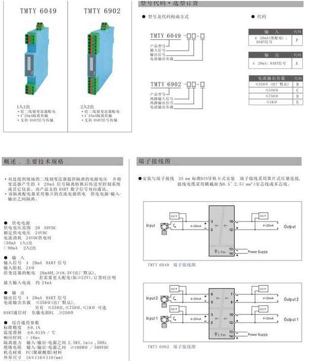 TMTY6049,TMTY6902 电流信号输入配电隔离器(支持HART)