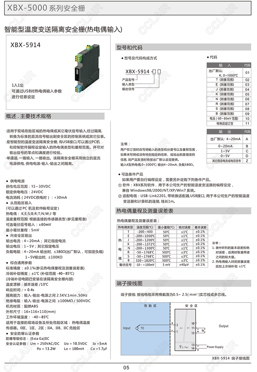 XBX-5914,XCX-5914-02C,XCX-5914-03C,XCX-5914-04C,智能型温度变送隔离安全栅(热电偶输入)(一入一出)