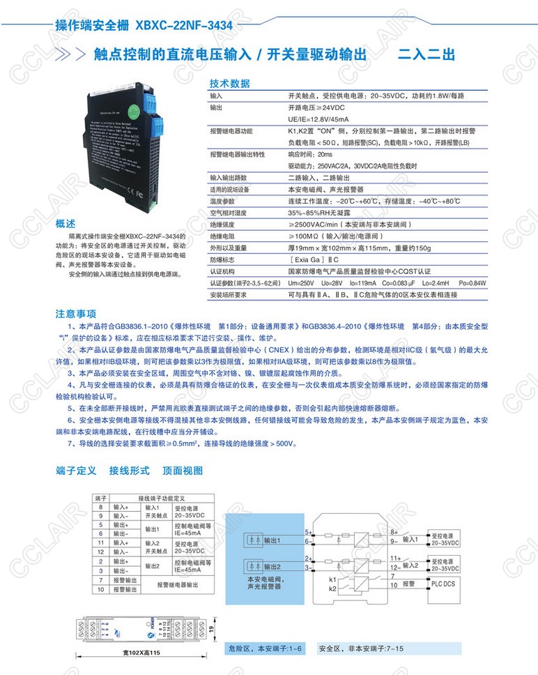 XBXC-22NF-3434,操作端安全栅开关量驱动输出(二入二出)