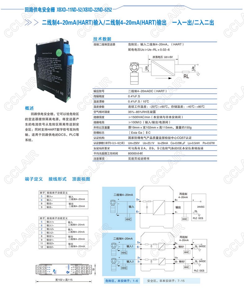XBXD-11ND-52,XBXD-22ND-5252,回路供电安全栅二线制4-20mA输入,二线制4-20mA输出