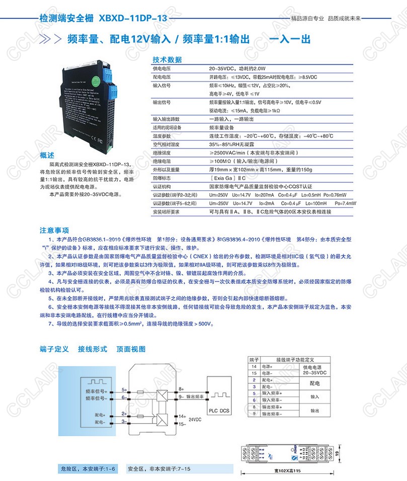 XBXD-11DP-13检测端安全栅 配电12V频率量输入,1:1输出(一入一出)