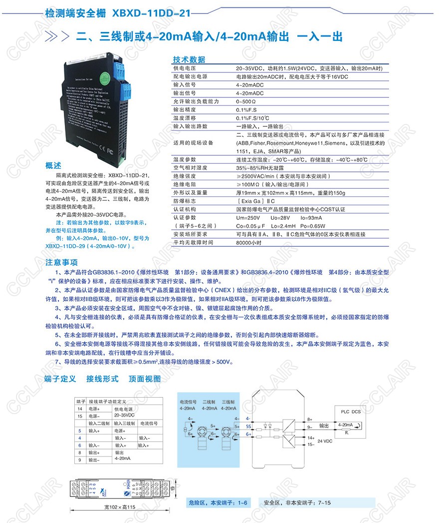 XBXD-11DD-21,XBXD-11DD-29检测安全栅二、三线制或直流4-20mA输入,4-20mA输出(一入一出)