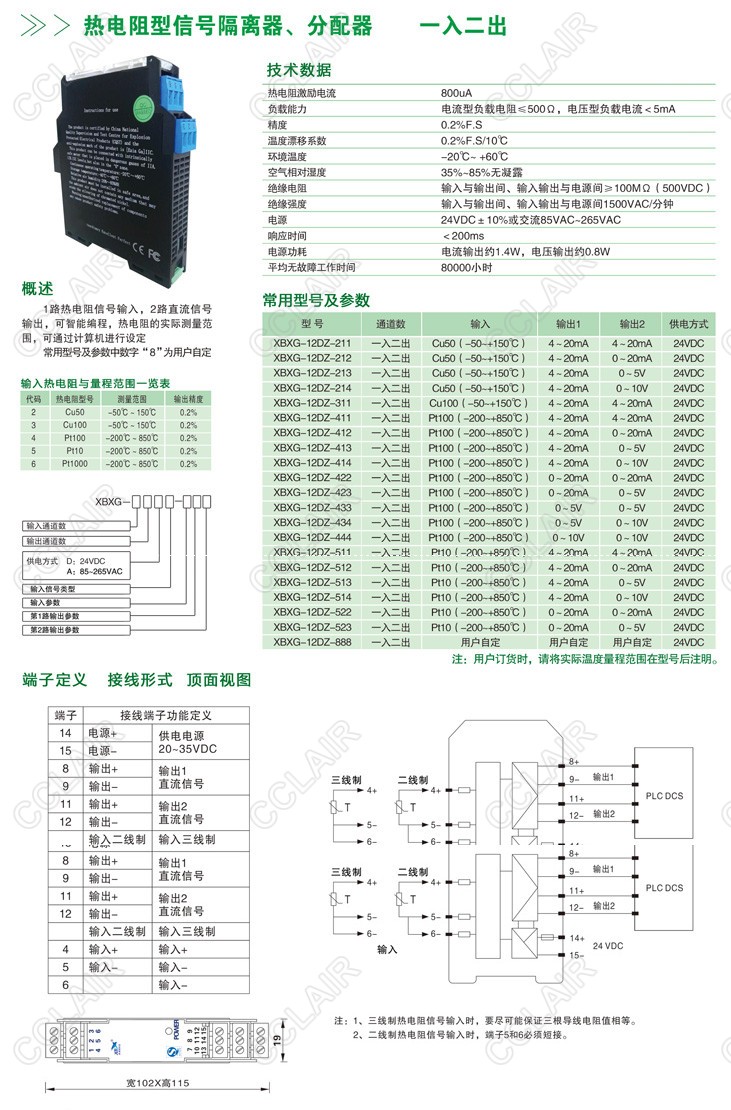 XBXG-12DZ,XBXG-12DZ-512,XBXG-12DZ-513,XBXG-12DZ-514,热电阻型信号隔离器、分配器(可组态)(一入二出)