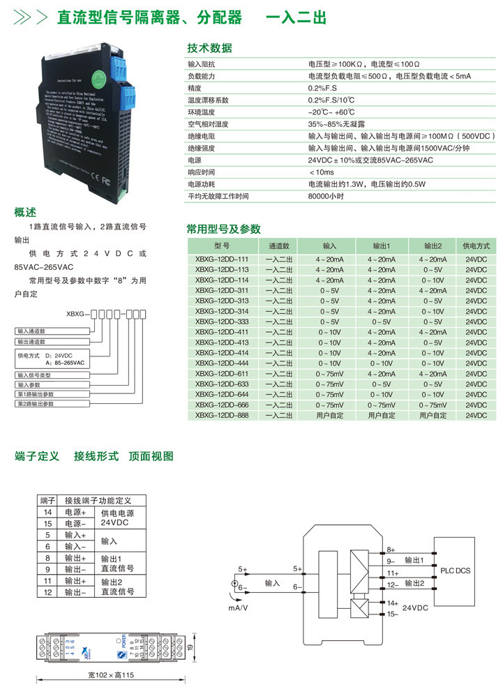 XBXG-12DD,XBXG-12DD-111,XBXG-12DD-113,XBXG-12DD-114,直流信号隔离器、分配器(一入二出)