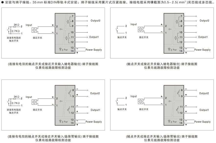 可选择带有输入线路故障检测功能的开关量输入隔离器和没有线路故障检测功能的开关量输入隔离器。