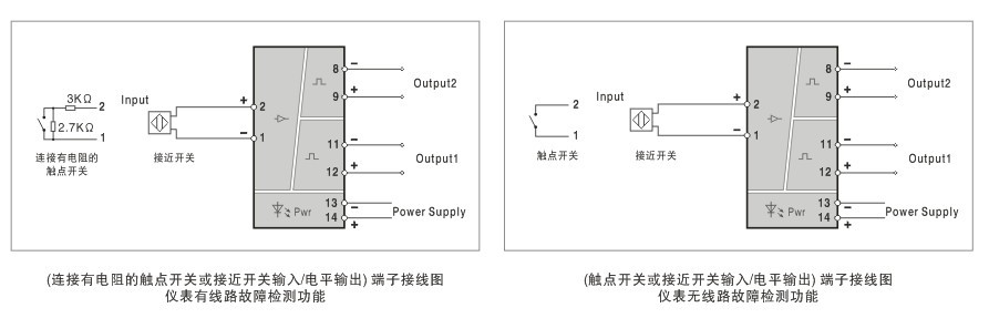 本仪表出厂设定为: 当检测到输入线路故障时, 仪表面板上的故障检测指示灯亮,输出继电器触点为松开状态 ( 如果是晶体管输出,则晶体管不导通; 如果是电平信号输出, 则输出为低电平信号)。